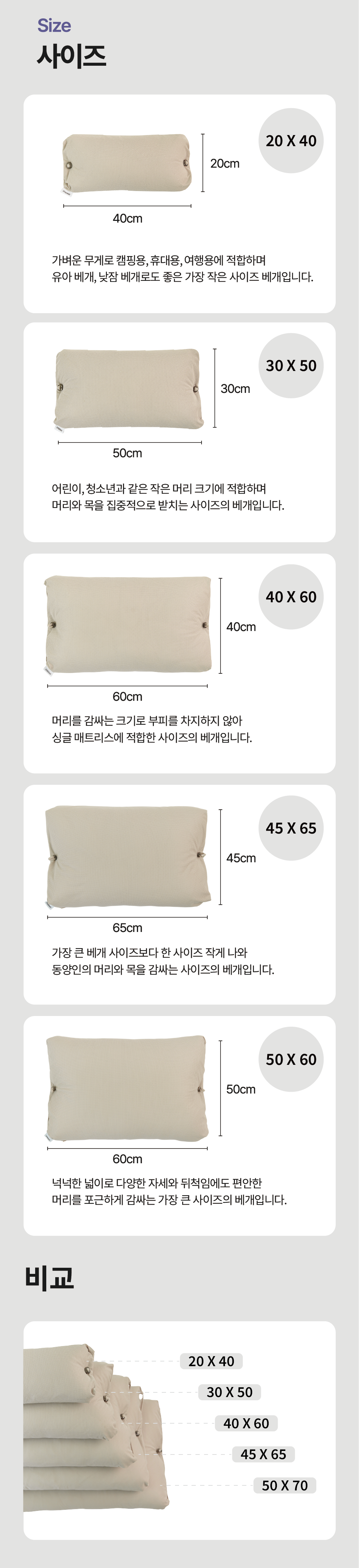 내 체형과 취향에 맞는 베개 크기를 직접 선택해 보세요.